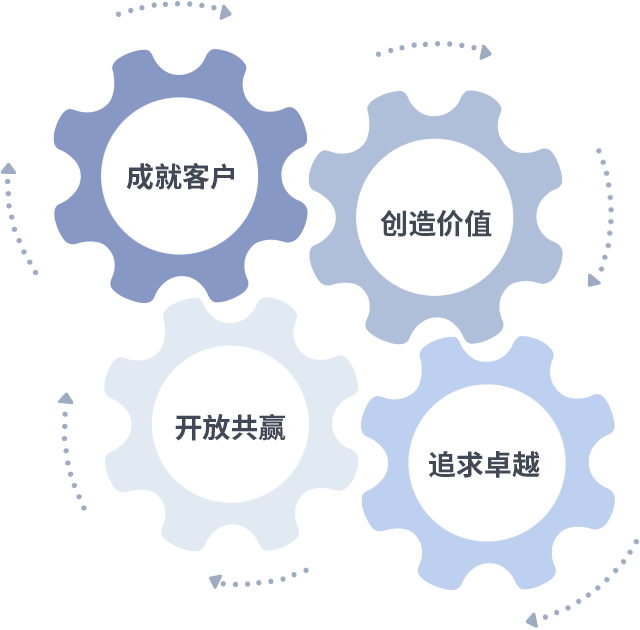 成就客户是一切决策的出发点,创造价值是衡量所有工作的标准,追求卓越是逐梦国际做事做人的态度,开放共赢是逐梦国际的格局也是最终的结果。价值观的齿轮环环相扣,推动着组织里的每个人不断向前。